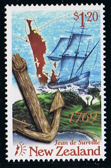 On a stamp of $1.20 issued in February 1997 by New Zealand you can find a ship it is an image of the ship, Jean Françoise-Marie de Surville used during his voyage in the Pacific. The stamp shows also the “pa” (protected Maori village) at Tokerau where the ship anchored. The Surville’s anchor is shown, indicative of the successive anchors which were lost on the coast of New Zealand.