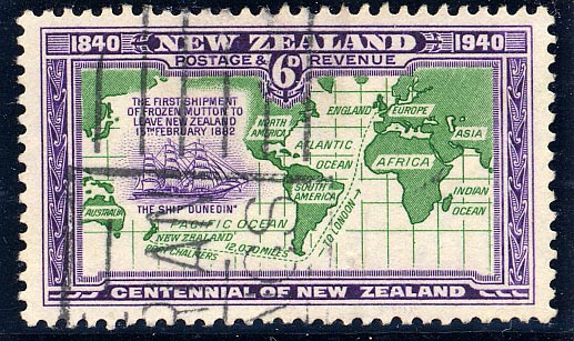 This stamp depicting a Shaw Savill & Albion vessel was issued in 1940 by the New Zealand post office and features the full-rigged ship Dunedin. In 1882, by the introduction of refrigerating machinery on board the vessel, she laid the foundation of the frozen meat industry between New Zealand and this country. She was chartered by the New Zealand and Australian Land Co., Ltd., who, in co-operation with the Albion Line, had the ship fitted with a Bel-Coleman cold air freezer. In the following year the Dunedin was taken over by the Shaw Savill Line when they purchased the Albion Line. For nine consecutive trips the ship was chartered to carry frozen meat cargoes.