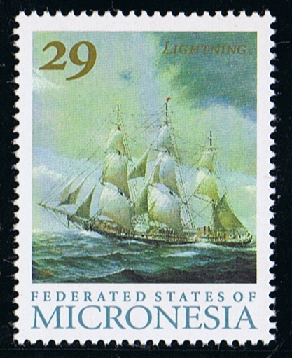 The stamp issued by Turks & Caicos in 2001 with the inscription “The Clipper Ship 1845-1865 (USA) depict the clipper LIGHTNING. The stamp is designed after a painting made in 1930 of the ship by the Japanese painter H Shimidzu, Yokohama. http://blueworldwebmuseum.org/item.php? ... 229&catid=