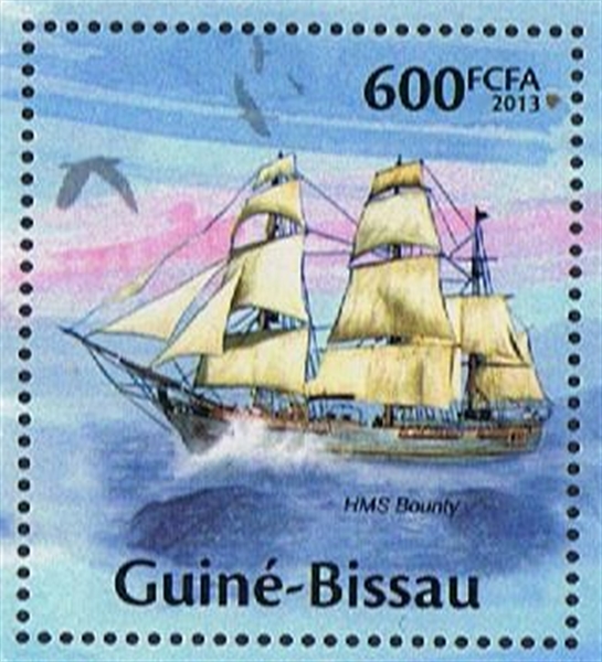 Guinea Bissau 2013 600 fca sg?, scott? (the stamp gives HMS BOUNTY but she had only three yards while the stamp shows a ship with four yards, so she must be the replica of 1962.)