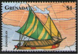 еlaborately carved and painted. Large ones decked, small ones undecked; most of hold area protected by a low,peaked- roof deckhouse. Employs 2 massive quarter rudders lashed against a crossbeam and worked against a heavy . H-shaped support on the after deck. Two short masts stepped forward of the deckhouse. Support triangular sails. apexes down. Yards at top and bottom; bamboo spar from the deck braces outer end of the upper yard at the proper angle; yards also stayed from a boom set out over each side. Ring on the end of the upper yard of the smaller foresail runs over the bowsprit as the tack.A 3rd temporary sail may be raised from the deckhouse.Poled in narrow waterways. Crew of 6-7 on a large vessel, 3 on the smaller. Average length ca. 15m;length of a large janggolan 20m, beam 7m, hold depth 2.3m.