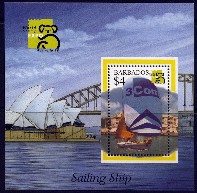 The yacht depicted on this miniature sheet of Barbados with the sail 3COM is a Challenge 67 type, an all steel yacht built by Devonport Management Ltd yard.