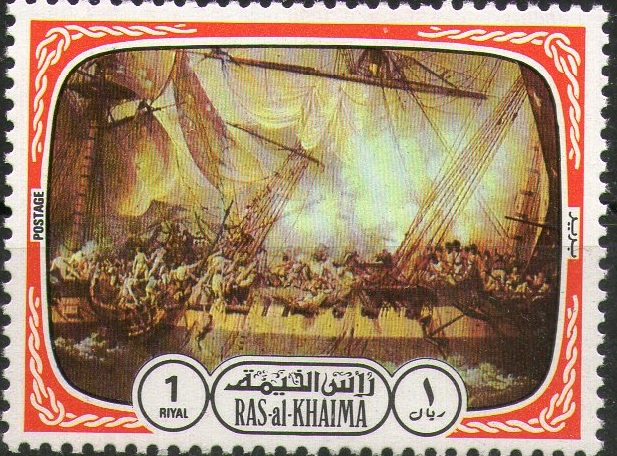 The stamp 1,0 riyal depicts fragment of the painting Louis-Philippe Crépin: HMS Ambuscade VS Bayonnaise.