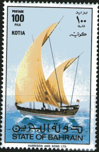 Large, fast, mainly Indian-built trader reported as early as the 16th century. In a modifiеd form, still plies the waters of the Arabian Sea,traveling to the east coast of Africa, into the Persian(Arabian) Gulf, and along the Indian coast. A few built in Sri Lanka and at Persian Gulf ports. The kotia similar to the Arab-built baghla*, and is often called a baghla and its variant names. A superficially modified kotia used by Arabs is called a ganja*. The kotia of the Maldive Islands was called a buggalow . An aft-facing, stylized parrot's head on the stemhead, a castellated poop, raked transom stern with vestigial quarter galleries, and the 5 stern windows of the baghla were distinctive of early kotias. Modern craft often have painted scenes in place of the stern carving and windows. Hull strongly built, bottom sometimes coppered; heavily oiled and stained above the waterline; bottom coated with white pitch.Topsides were often gaily painted. Modern kotias not oiled but painted in a variely of colors, and the stemhead painted while. Long grab stem, strongly raked; bow low, considerable sheer. Rudder passed through the poop in the older vessels; on new models, it is lashed to the sternpost. Steered with either tiller or wheel. Fully decked; square hatches; an undecked kotia may be called a pahala. Generally carries a large muchwa* and a small dhoni* on deck.Two masted mainly, but some also step a small mast outboard over the stern. The main- and mizzen-mast may both rake forward, or the mizzen may be vertical. Square topsail set from a light, short topmast.Large masts rigged with a forestay and a pair of shrouds on each side. Lateen sails; main yard maybe longer than the vessel; mainsail tacked to a spar rigged out over the bow. Several spars at the stern serve as outriggers to the mizzen sheet and the small transom sail. Some set a jib. Most now have engines also.