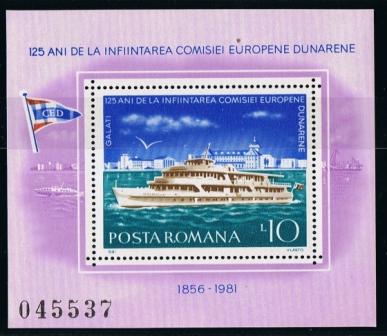 The stamp in a souvenir sheet shows the modern river passenger ship MOLDOVA. In the background of the stamp, and continued on the S/S, one sees the river harbour Galati, and new construction on the cliffs of the town.