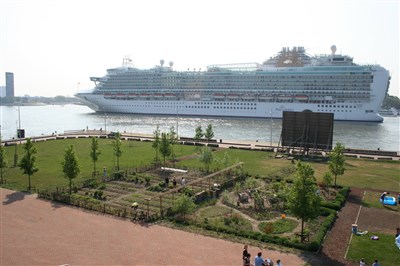 On the photo when enlarged you can see on the ships hull the logo of the P&O Cruises, the only P&O cruise vessel which visited Rotterdam in 2011 when the photo was taken and match with the stamp is the AZURA when she on 23 April 2011 visited Rotterdam. http://www.youtube.com/watch?v=WyV-qVplu6M