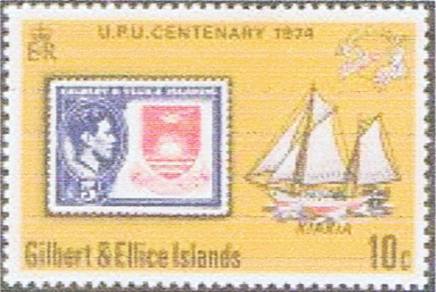 KIAKIA. Ketch used for carrying mail in Gilbert & Ellis Is during reign of King George VI. Two masts the smaller one being stepped forward of the rudder head - Gilbert & Ellis Is 1974. 10c. SG233 (LB 6/14)