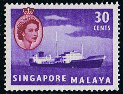 Singapore 1955 30c sg48, scott? (She looks like a Shell tanker, around that time Shell had some tankers under Singapore flag)