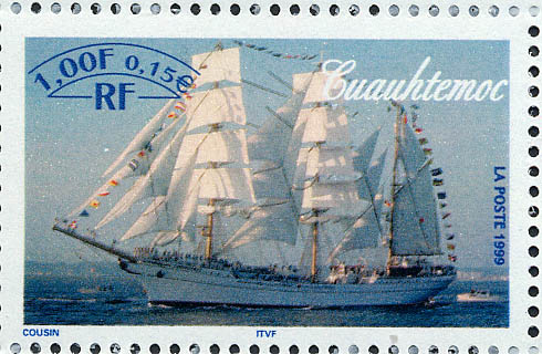GUAUHTEMOC. 3-masted Sail Training Ship. Built in 1982 by Astilleros y Talleres SA Bilbao, Spain, for the Mexican Navy. Displacement 1760tn(full load) L90.5m. B12m. Dr5.1m (297x39x17ft) Sail surface 2200 sq. m. Diesel engines 1125hp. 11kn. Steel hull. Complement of 185 + 90 cadets. The last of a series of four Sailing ships built by the Naval shipyards of Bilbao - France 1999. 1fr. SG3609. (WP September 99)