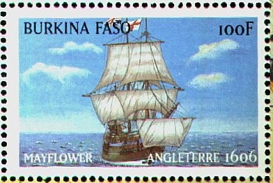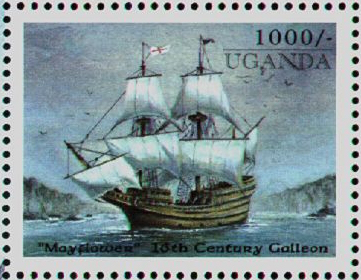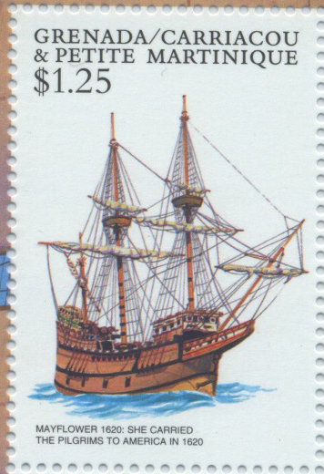 In 1620 the three-masted Mayflower, with a party of 130 English Puritans on board, left Plymouth under the command of Captain Jones of Rotherhithe and reached the coast of North America near present-day Massachusetts after a voyage lasting 67 days. Here the Puritans founded the first permanent English settlement in New England. According to existing records, the Mayflower was originally built about 1590 to carry wine and had a deadweight capacity of 180 tons. On the basis of a model made in 1926 by Dr R.C. Anderson and at present located in the Pilgrim's Hall, Plymouth, Massachusetts, a replica of the original ship was built in 1956. This Mayflower had carrack rigging and generally the appearance of a small galleon. On 17 April 1957 the Mayflower II set sail with a crew of 33 under the command of Captain Alan Villiers from the small fishing port of Brixham in Devon. She left Plymouth on 20 April and reached Plymouth, Massachusetts, after 54 days. While the Mayflower of the Pilgrim Fathers took a direct route across the Atlantic, Mayflower II took a southern route by way of Madeira and the Canary Islands. She covered the distance of 5,500 sea miles in thirteen days less than her famous mother–ship in 1620. - Bangladesh 1976. SG82. Bulgaria SG2867. Great Britain 1970 SG822. Guinea Bissau SG952. Isle of Man SG322-3. Liberia 1975SG1239. Mali SG289. Pitcairn Is SG170. Sharjah 1969 NC. U.S.A. 1920. lc-5c. SG556-8.1416.