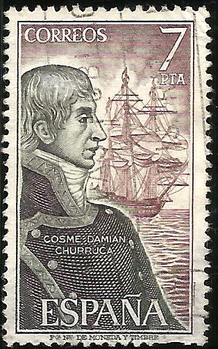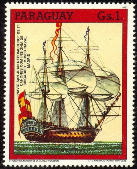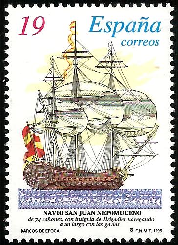 It was outfitted with a total of 74 cannons (28-24 pound , 30-18 pound, 8-12 pound, and 8-8 pound), and was manned by 8 officers, 11 midshipmen, 19 leading seamen, and 492 able seamen. It's supply capacity was for 60 days victuals and 80 days water. It rendered numerous important services to the Armada (Fleet), some of them in the Caribbean where it participated in several sleges and was distinguished in 1779. The battle of Trafalgar is the historical feat in which it participated and of which we have the best account. In spite of being unmasted by Admiral Nelson's artillery on the 21 October 1805, it achieved glory in this battle under the command of the celebrated brigadier Don Cosme Damian Churruca and constituted for the Spaniards a handsome example of the heroism of their race and the bravery of their sailors. While the wounded Admiral Nelson continued to direct the battle, the Brigadler Churruca, whose leg had been torn off by a howitzer, the deck of his ship covered in the blood of his wounded and dead, continued to voice the command "Fire!". However, unable to break the circle of fire formed by the six enemy ships, which counted among others with the famous Defiance, Tonnant and Dreadnought, the San Juan Nepomuceno yielded with over 400 dead and injured on board. The English obtained the victory but paid a high price in lives and material.