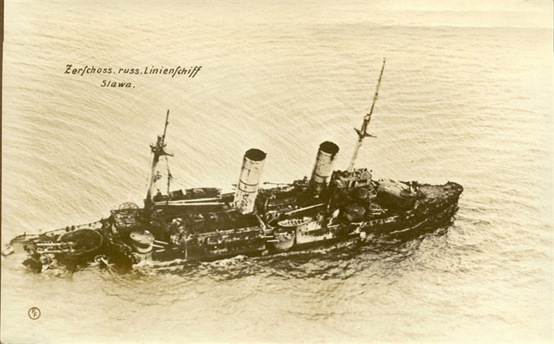 8 – 19 August 1915 SLAVA was flagship of a Russian squadron of 3 gunboats, 1 minelayer and 16 destroyers when the German High Sea Fleet tried to destroy this squadron in the Gulf of Riga and help the German army to take the important town of Riga. The German squadron consisted of 4 battleships, 1 battle cruiser, 4 cruisers and 56 destroyers.