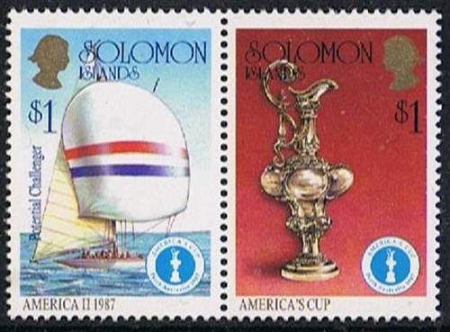 AMERICA II (US 46) was one of the three 12-metres yacht all named AMERICA II only the sail number was different, the others carried the No. US 42 and 44. Which yacht is depict on the stamp is difficult to say, not a sail number is visible, all were in Freemantle but the US 46 was the only yacht used in the Challenge Race, the other two yachts were used for training.