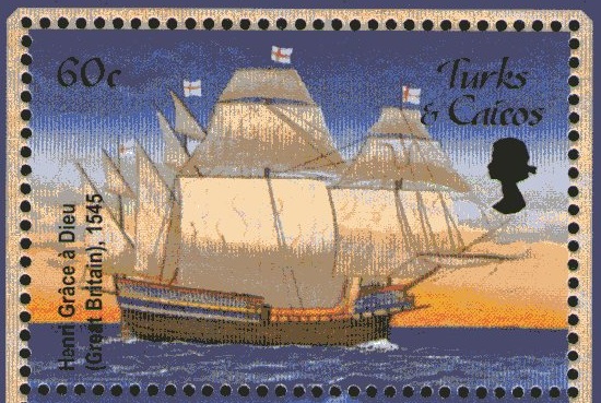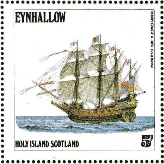 This 10c. stamp depicts the somewhat fanciful painting by Holbein, in the National Maritime Museum, of the Henry Grace A Dieu (Great Harry), the pride of Henry VIII's Navy. Henry VIII, because he established the beginnings of present-day naval law and administration, has been called the "father" of our Navy. The Great Harry, as his subjects christened the ship, the largest and most famous of his vessels, was launched in 1514, Woolwich Dockyard having grown up round her building. She measured 1,000 tons, whereas the King had only three other ships of 700 tons or over. Her 384 guns (estimates vary) were mostly very small, but the heavier ones had ports cut for them through the ship's side.