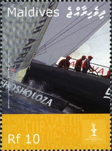 The yacht depict on this 80g stamp of Micronesia with sail number FRA-60 is the yacht used by the French syndicate K-Challenge Areva Challenge in the Louis Vuitton Cup race in Valencia in 2007.