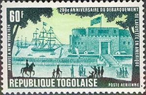 In 1977 Togo issued a set of four stamps and a miniature sheet to commemorate the 200th anniversary of Lafayette’s arrival in America.