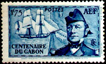 In 1839 the French Navy brig La Malouine, commanded by Lieut. Count Louis Edouard Bouet-Willau¬mez, cast anchor in the mouth of the Gaboon River and the Count set up the standard of France after he had obtained from the native chiefs the right to make a settlement. The event is commemorated by a centenary set of stamps issued by French Equatorial Africa in 1939 and show Bouet-Willaumez with La Maloiuine. Unfortunately the stamp designer knew little of sailing ships, for the sails on the foremast are depicted abaft the mast ! Lieut.BouetWillaumez later became Governor of Senegal, served in both the Crimean and Franco-Prussian Wars, and commanded the French Baltic Fleet. He died in 1871.