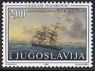 The stamp is designed after a painting “Brig PIERINO 4 VIII 1881 in storm near Cuba, and a note on the back of the painting, says the owner Nikol Armelin from Budva Captain Vlado Ivelic from Risna, Austria-Hungarian flag on main gaff. Blue-white checkered flag + ‘1’ (or “”) code flag (?) on main mast: Many sails set but all torn. Spanker gaff lowered to let wind out.