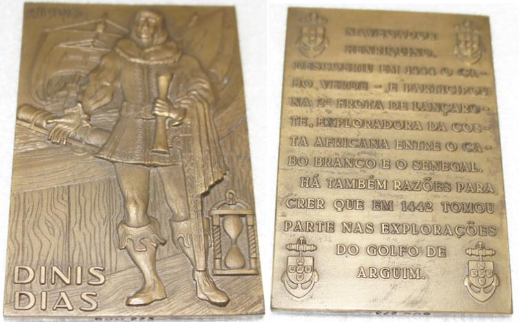 Dinis Dias (on stamp to the right) was a Portuguese explorer of the 15th century. In 1445, Diaz, belonging to the well-known seaside family started to drive vehicles in his old age, and decided to do research because "he does not want to live in peace prosperity soft" and "wants to see and hear more than others" .He went out of Portugal and sailed along the West African coast, sailed past the mouth r.Senegal, set a new record, reaching a point about 800 km south of Cap Blanc. It is the westernmost part of the African continent, cape issued far out to sea and was overgrown with trees, he called Cap-Vert (Diaz called it Cape Verde, "Verde" by Portuguese "green", a reference to the lush vegetation in the area). Note that Diaz did not find the Cape Verde Islands, and in fact the Cape. He landed on both hills crowning the cape, set wooden crosses. The success of this expedition was possible because Diaz focused on exploration, rather than slaves, who were many Portuguese sailors in Africa, while in the spotlight. One expedition returns to Portugal with dozens of slaves, Diaz also only took four prisoners. Later that year, Dias sailed with the explorer Lançarote de Freitas in a large scale slaving expedition to Arguim . Medal - Portuguese navigator Dinis Dias- Vasco Berardo -1973-74.