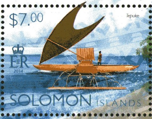 A “Tepukei” (from Te Puke , meaning an ocean-going canoe) is a very old Melanesian and Polynesian boat type, produced primarily by the Polynesian -speaking inhabitants of Taumako (Duff Islands). It was first reported in print by Spanish explorer Álvaro de Mendaña in 1595, on his visit to the Santa Cruz Islands . A “Tepukei” looks like an outrigger canoe with a crab claw sail , and is in fact a very sophisticated ocean-going sailing ship, belonging to the proa (two hulls of different size) types. Its main differences with other proas are: The main hull ( vaka ) has an almost circular section whose submerged profile remains constant despite heeling, and has a minimum of wet surface when heavily loaded. The vaka's top is very close to the flotation line, so it is closed with planks and the accommodations for the crew are on an elevated platform over the akas (the beams connecting the main hull and the smaller, windward hull). The typical crab claw sail, one of the most efficient sail types known.