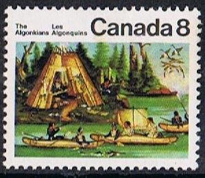 The canoes in front of this 8c stamp were used by the Algonkians people and are made of birchbark.