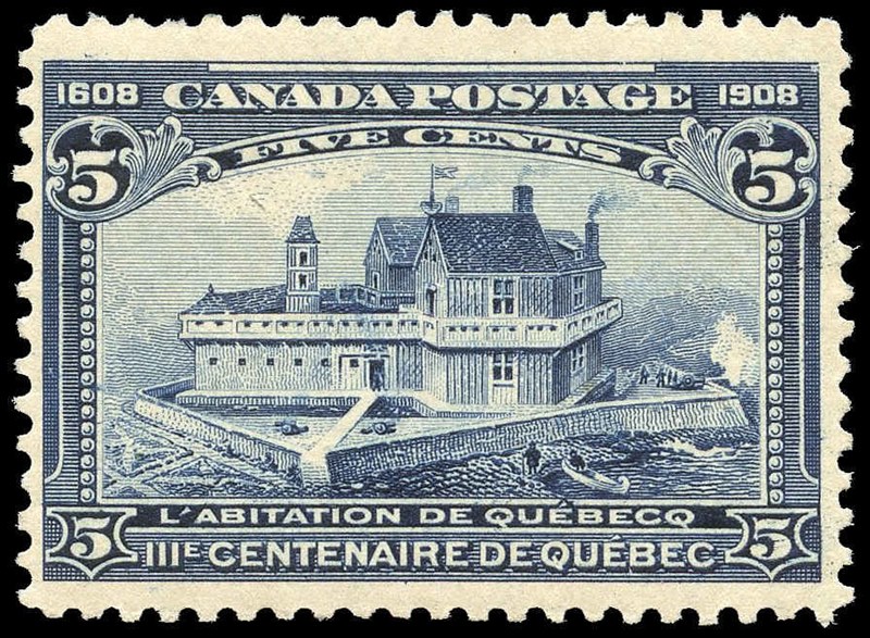 Canada 1908 3c sg?, scott 99 (the bark canoe is in the foreground of the stamp.)