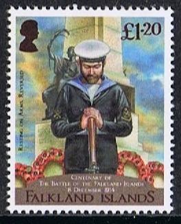 The First Day Cover illustration is based on a photograph of the unveiling of the Battle of the Falkland Islands war memorial in Stanley.