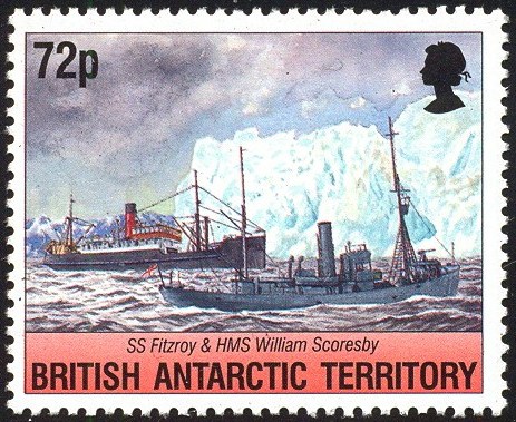 During World War II, there were fears that German naval forces may be using the South Shetland Islands and the northern parts of the Antarctic Peninsula as bases for U-boat raiding operations against the Allies. As a result, the British Admiralty conceived Operation Tabarin to patrol the area by establishing bases there. These were eventually built at Deception Island and at Port Lockroy. The stamp depicts HMS William Scoresby patrolling Whalers Bay, Deception Island, on arrival in February 1944.