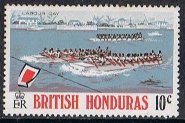 This stamp for the Labour Day festivity in British Honduras shows us a rowing regatta in Belize City, The craft used in the regatta, with as it looks have a square bow is most probably a “batteau” , a term in Belize applied to a “pitpan” that has been enlarged by sawing it in half longitudinally and inserting a wide plank. May require up to 40 paddlers.