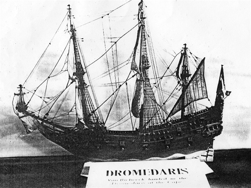 The design of this ancient sailing vessel is said to be the DROMEDARIS, being Van Riebeeck’s ship on which he arrived at the Cape in 1652.