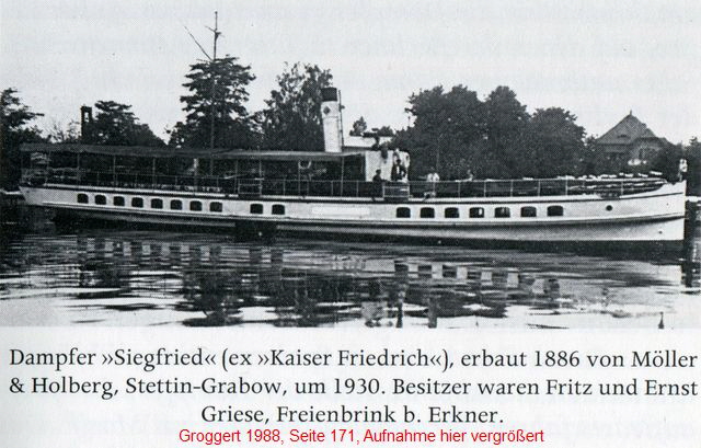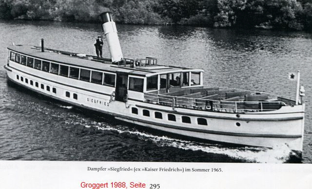 Built in 1886 by Möller & Holberg, Stettin, #275, (Oderwerke Maschinenfabrik und Schiffbauwerft, A.G. Grabow) orginally for Stettiner Lloyd, in 1889 delivered to Spree-Havel Dampfschiffahtrs Geselschaft as KAISER FRIEDRICH III.