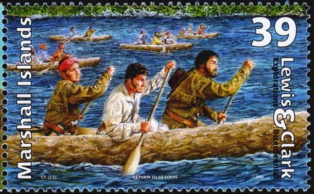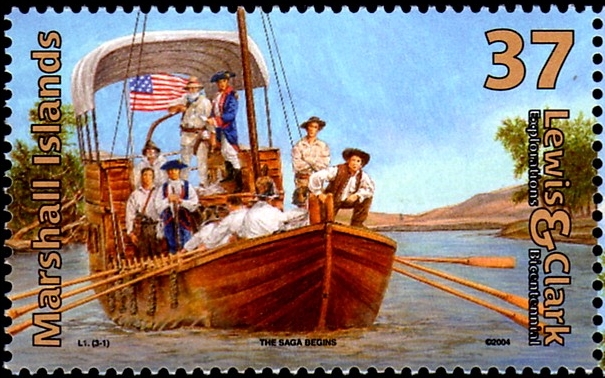 Keel boats were the precursors of river steamers and advanced the course of civilization westwards. They were adaptable craft and made headway with a sail, tow ropes, oars and poles. The illustration on the postage stamp portrays the landing of Lewis and Clark on the banks of the Missouri River before moving into the expedition's winter quarters. The main figures, Lewis in the foreground and Clark directly behind him, are drawn from the Lewis and Clark Monument, in Charlottesville, Virginia. Behind the two figures stand the Shoshone Indian girl Sacagawea, taken from the statue of Sacagawea, in the State Capitol grounds at Bismarck, North Dakota. The Indian girl, is honoured chiefly on the stamp for her aid in securing the friendship of the Shoshone Indians and in guiding the expedition over the Great Divide. When Sacakawea reached the Great Divide she was reunited with the Shoshones from whom she had been kidnapped previously. It was through her efforts that Lewis and Clark were able to get ponies from the Shoshones to continue their overland journey. Behind Sacagawea is shown the figure of her husband, the French Canadian trapper and interpreter, Charbonneau, who bought the girl as a slave from her captors and married her.