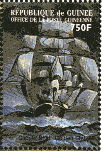 The “Golden State”,built in 1852 by Jacob A.Westervelt for Chambers and Heiser of New York,was launched in New York on January 10,1853.According to O.T.Howe and F.C.Matthews:”she had very fine lines,her ends being long and sharp and was a beautiful vessel,alow and a aloft.She was a favorite vessel with shippers and also a profitable one to her owners”.Recorded as having the longest record of any ship in the China trade,the “Golden State”was an “extreme clipper ship”,designed to carry cargo at high speeds. In 1860, the two “extreme clipper ships”, “Golden State” and “Golden Fleece” left New York on the same day. Despite taking different routes in the Atlantic section of their voyages, the two ships arrived in San Francisco a few hours apart, on Oct. 29th, after passages of 128 days. She made a number of exceptionally fast voyages from New York around Cape Horn,stopping in San Francisco on the way to Shanghai and Hon Kong,a few times continuing to England,Ireland,and once Germany, returning to the New York in ballast.After 1883,when she was renamed the “Anne C.Maguire” by her new Canadian owners,she served in the Atlantic trade under the Argentine flag.She went ashore and was wrecked on Cape Elizabeth,Maine,in December 1886.