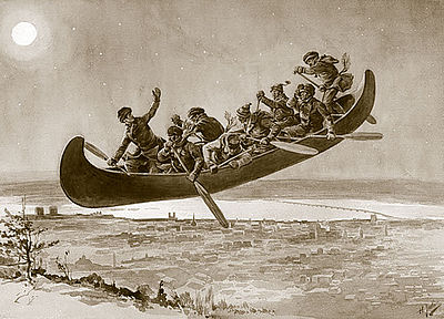 “La Chasse-galerie” also known as "The Bewitched Canoe" or "The Flying Canoe" is a popular French-Canadian tale of “voyageurs” who make a deal with the devil, a variant of the Wild Hunt. Its most famous version was written by Honoré Beaugrand (1848–1906). It was published in The Century Magazine in August 1892.