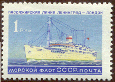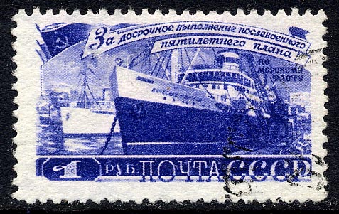 I believe that the vessel shown on the Russian 1 Rouble stamp, alongside the quay, is the twin-screw turbo-electric vessel Viacheslav Moloyof built in Holland in 1939. Of 7,494 gross and 3,565 net tons on dimensions 429.2ft. x 60.21 x 31.71 she belongs to the U.S. S.R. Black Sea section.