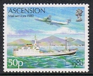 50p) Mail service today: Surface mail is now carried by the RMS ST HELENA, shown here against the coastline of Ascension. Airmail is carried in this scene by a Lockheed C141 aircraft of the Military Airlift Command of the USAF, completing the picture of the current Ascension mail service.