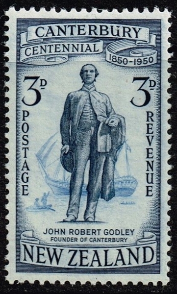 For the Canterbury Centenary the New Zealand Post issued a set of stamps in 1950, the 3d stamp depict John Robert Godley, leader of the Canterbury Association's venture and the Founder of the Province. Behind the statue of John Robert Godley is a sailing vessel visible which is identified as the CRESSY which brought part of the first group of settlers to Canterbury.