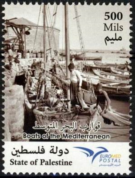 Palestine issued one stamp for Euromed, the stamp is designed after an old photo which shows us wooden fishing-boats alongside a quay in a fishing port in Palestine.