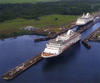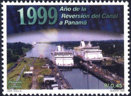 The Panama stamps issued in 1999 of 0.45c depict two cruise liners of the Holland America Line in a lock in the Panama Canal, I found in Daily Collection of Maritime Press Clippings 2010-079 a photo which shows that on 29 April 1996 two cruise vessels of the Holland America Line together were in the Panama Canal locks, the MAASDAM and RYNDAM. I believe these two vessels are depicted on the stamp.