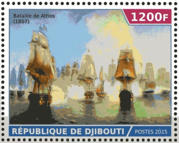 The design stamp is made after painting of Aleksey Bogolyubov: “Battle of Athos 1807”.