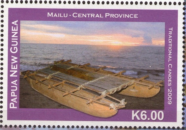 Double canoe of Mailu Island,close off the eastern end of the south coast.Used mainly for trading. Dugout hulls; the main hull larger the somewhat smaller hull serving as an outrigger.Hulls almost round in cross section; center hewn out.Sides raised with vertical planks to form washstrakes,and ends closed off with breakwaters; often carved;washstrakes and breakwaters lashed to dugout.Caulked with scraped inner bark of a special tree. Canoe ends bluntly pointed. Hulls set ca. 1.2-1.5m apart;multiple transverse poles connect the 2 hulls,passing through holes in the washstrakes. Poles extend outboard on the main hull. Planking laid atop the poles; portable shelter might be placed on the platform; fireplaces at either end. Rudder lashed to one of the poles near the stern. Mast lashed to bracing along inner side of the main hull; stayed fore-and-aft from outrigger hull. So-called crab-claw sail raised by a halyard rove through a hole in the masthead, and secured about midway along one yard close to the mast.Lower end tacked at foot of mast. Yards as long as 13,5m along both sides of sail; these bend inward at the top.Mat sail made in vertical strips with deep curve at the top. Sailed with outrigger hull to windward.Rowed when becalmed, poled in shallows.Crew of 6. Most 9-10.6m long.