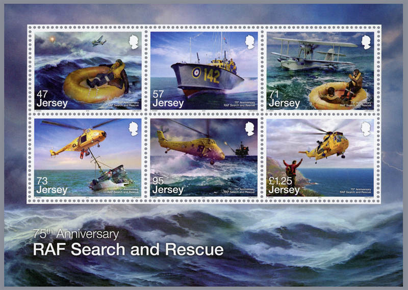 A new stamp issue commemorating the 75th anniversary of the RAF Search and Rescue Force is released by Jersey Post on 6 February 2016. The six stamps and Souvenir Sheet feature dramatic search and rescue scenes created by illustrator, Sharif Tarabay.