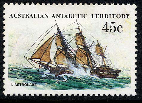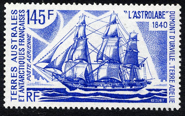 The stamp image is based on a watercolor by F. Roux: “Astrolabe 1826”.