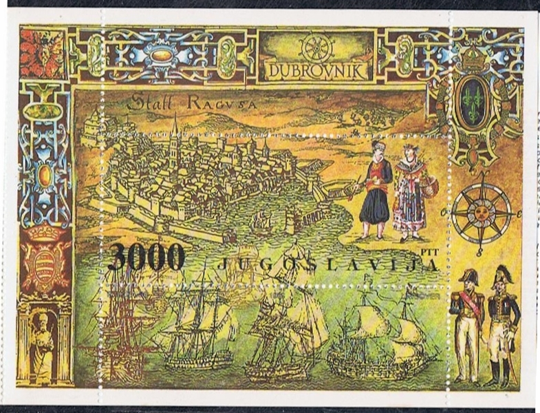 The 3000d stamp shows us an engraving of Dubrovnik with various sailing ships in the harbour of Dubrovnik and various symbols of Dubrovnik and its surroundings.