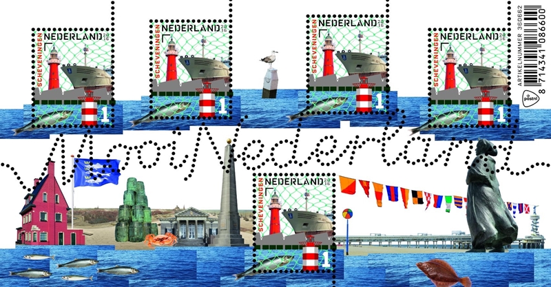 The Beautiful Netherlands 2016 stamp sheet: “Scheveningen” is based on the layout and perforation used for the Beautiful Netherlands series since 2005. The five identical stamps with a value denomination of 1 for mail within the Netherlands feature typical properties and buildings found in the town of Scheveningen, including the fish auction building with its striking silhouette (pictured), the lighthouse (pictured) and the trawler SCH 6 ALIDA with the sea below, showing a beacon which in reality is on one of the jetties. Pictured at the bottom is an image of a herring. The image is spread across the stamp and the back of the sheet. The top and bottom parts of the stamp are linked together by a traditional fishing net in a contemporary bright colour. The background of the stamp sheet contains images of various Scheveningen landmarks, including a seagull perched on a scaffold pole, a 1930s home at the centre of the harbour area, the barrel monument, Panorama Mesdag overlooking the town of Scheveningen, Paviljoen Von Wied in the dunes, the obelisk for the later King William I’s arrival in 1813, the Scheveningen Pier and Gerard Bakker’s fisherman’s wife statue. The strip of sea pictured on the stamps has been extended horizontally across the sheet like a tile panel. In the water at the bottom, we see both the herring shown on the bottom stamp and other fish species: from left to right, two mackerels, three herrings, a brown crab and a plaice. The font used is Oxide by FontFont, designed by Christian Schwartz (2010).