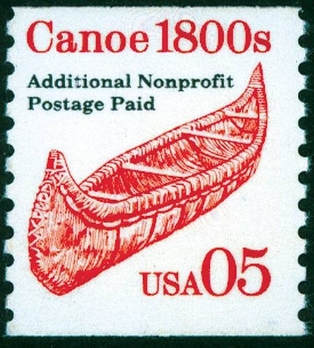 The canoe depict on this USA stamp is a birch bark canoe used by the Chippewa Indians in Minnesota in the 1800s.