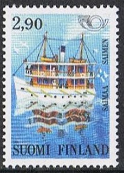 The stamp issued by Finland in 1991 shows us a stylized passenger steamer on Saimaa Lake in Finland.