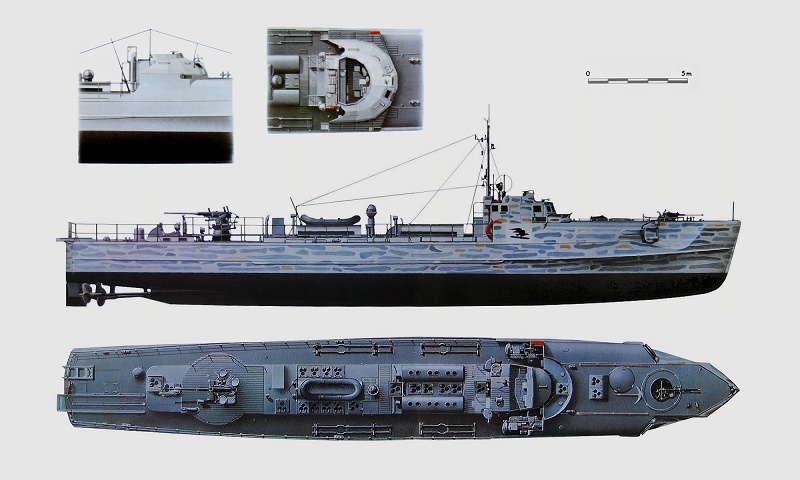Displacement:94/107 tons, Loa:3,10m. B:5,10m. Draft:1,40m. 3 Daimler-Benz engines:7500 hp. 3 shafts, 41 kn. fuel:17 tons, range:588 nm/35 kn. armament:2-533 mm. torpedo tubes and 2-30 mm. cannons.