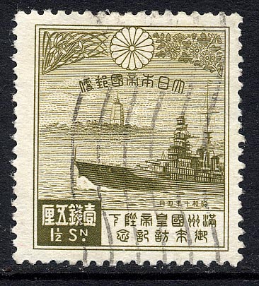 HIEL. Battle Cruiser. Japanese Navy. Built in 1914 by Kawasaki, Kobe. Keel laid 4th November 1911. Launched on 21st November 1912. Completed 4th August 1'914. 29300tn. L704'. B92'. Dr20'9". Powered by Parsons turbines. 13800hp. 4 screws. 18kn. Armed with Eight 14". Sixteen 6". Eight 5" AA guns. Four 21" TT. Complement 980. Demilitarised under the London Treaty and employed as a sea going Training Ship. The Emperor of Manchukuo visited Tokyo in her 1935. She was rearmed during WW2. On 14 November 1942 she was hit off Savo Is. in the Solomons by the US Navy and Air Force and scuttled as she could no longer steer, being the result of damage from gunfire. She sustained 85 hits including some 16" shells, 3 torpedo hits and bombs - Japan 1935. 6s. SG276-8. (LB4/80. 11/77)