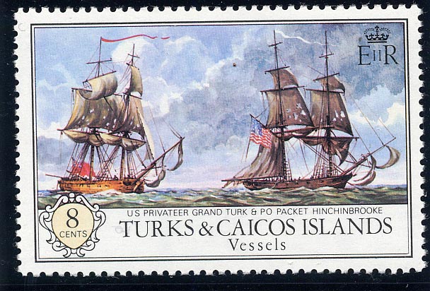 The U.S. privateer Grand Turk and Post Office Packet Hinchinbrooke from an old print of 1814; The print represents the situation of H.M. packet at the close of an engagement with the American privateer Grand Turk, of Salem, on May 1, 1814. The action commenced at 5.20 p.m. and continued until 7.30 within pistol shot range, during which the American ship twice manoeuvred abeam of the British vessel and was twice beaten off. After the failure of the second attempt, the Hinchinbrooke obtained a raking position, disabled and obliged the privateer to sheer off. The packet had a crew of 30 men and boys; the privateer 178 men. The Hinchinbrooke was armed with 69 carronades and 29 long guns; the Grand Turk carried 16 long guns, 9 carronades, and 11 other guns. The standing orders to the packets, when attacked, were "to run while they can, fight when they can no longer run, and throw the mails overboard when fighting will no longer avail.". The Hinchinbrooke, was built in 1813 for the Falmouth Packet Service of the Post Office by Capt. James and Company, at Falmouth. She was lost in a hurricane in the West Indies, date unknown.